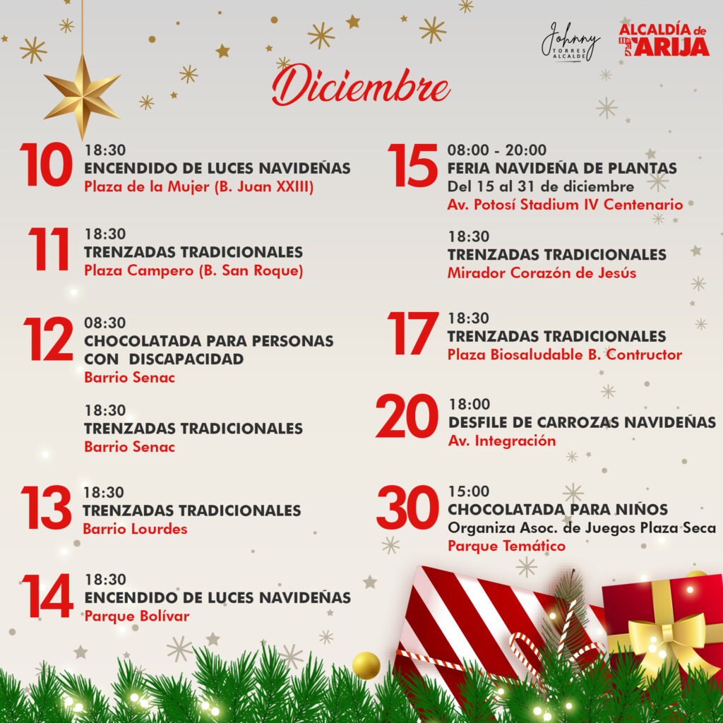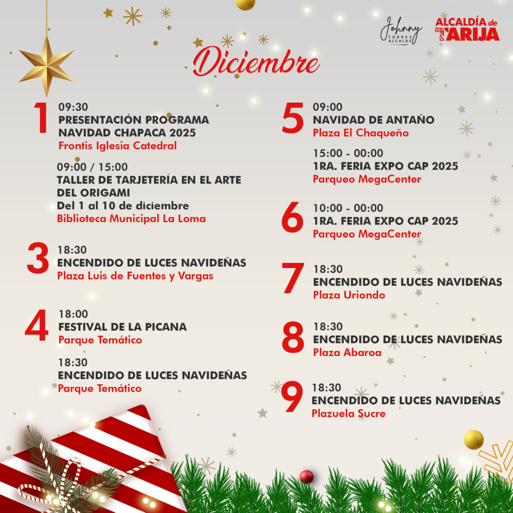 ✨ ¡Te compartimos el programa de actividades de la Navidad Chapaca 2025! ✨ Acompáñanos a vivir la magia de estas fechas y disfruta con nosotros de todas las tradiciones que hacen única nuestra Navidad. 🎄🎶 Ven, comparte, celebra… ¡y siente el espíritu chapaco en cada rincón! 🌟 ¡Tarija, lo que se siente no se olvida!