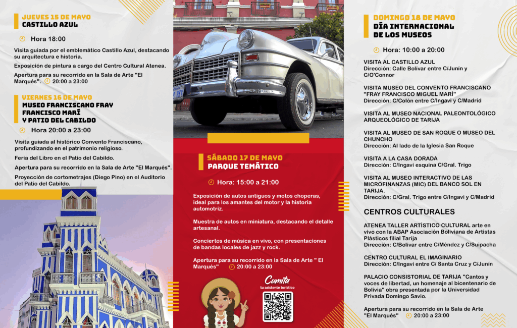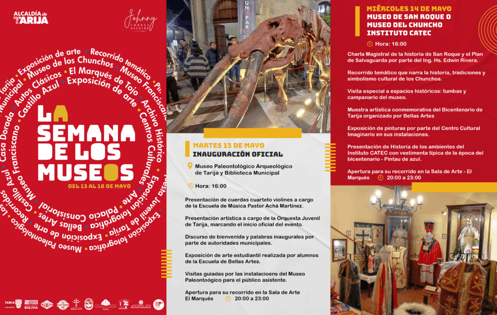 ✨¡Ya está aquí el Programa Oficial de la Semana de los Museos en Tarija!🖼️👉 Este mayo celebramos el Día Internacional de los Museos con una agenda llena de actividades culturales, educativas y recreativas. Museos, instituciones y centros culturales de toda la ciudad se unen para resaltar la riqueza de nuestro patrimonio y contar las historias que nos definen.🔸 Charlas, exposiciones, visitas guiadas y muchas sorpresas más te esperan.#SemanaDeLosMuseos #Tarija #DíaInternacionalDeLosMuseos #AlcaldíaDeTarija